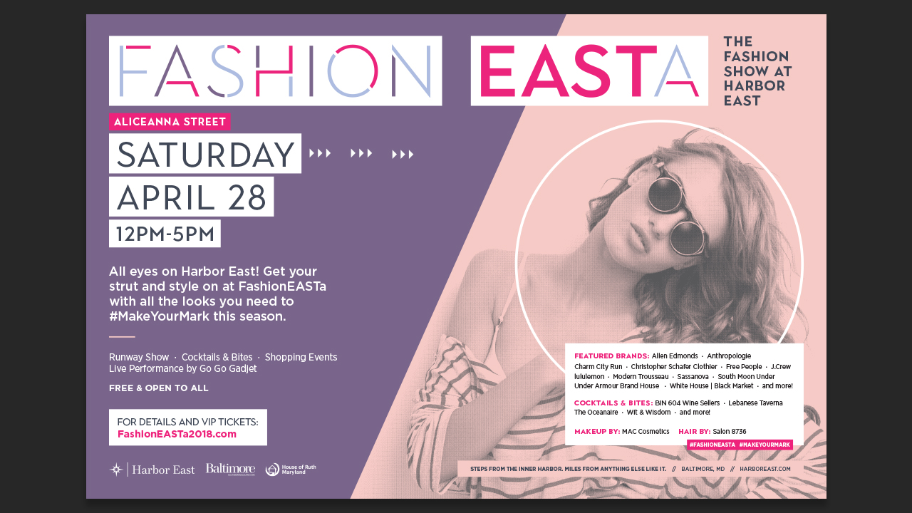 Harbor East's biggest event of the year is “FashionEASTa,” where its main road becomes a literal fashion runway where you can actually buy what you see in the shops that surround you. Exit10 has developed the creative concept and design theme for FashionEASTa each year, along with all the digital, traditional, and web advertising that comes along with it for this celebration of fashion and food.